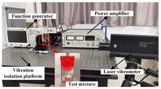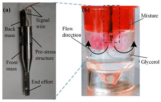 Further evaluation of the stirring performance was conducted by designing and manufacturing a prototype stirrer. The overall experiment setup is shown in Figure 19. The input signal was formed by a function generator (UTG 4082A) and then magnified by a power amplifier (HEAS-50). A laser vibrometer (LV-S01-KH), based on Doppler Effect, was utilized to test the resonance frequency of the micro-stirrer. For ease of experimental observations and cost-saving, a prototype with a bigger size was manufactured, comprising a back mass, a PZT, a front mass, a pre-stress structure and a beam with a scissor-type end-effort (Figure 20a). The PZT embedded in a hollow cylinder with a netted pre-stressed structure amplifies the driving vibration. The beam length, end-effort length, groove length, width and thickness of the stirrer beam were set as 20 mm, 7 mm, 2 mm, 3 mm and 0.5 mm, respectively. The groove angle was 80°, and the material of the stirrer was stainless steel (SUS 304). To simulate blood and thrombus, a plastic container was filled with glycerol (thrombus) and a mixture of normal saline and red colorant (blood). The volume ratio of glycerol to the mixture was 1:1. In the experiment, the driving voltage was 50 V with the scissor-type vibration resonance frequency of 3558.9 Hz, and the end-effort tip was inserted into glycerol 1 mm under the surface of glycerol. When the scissor-type vibration is excited, the glycerol flows reversely to the groove structure and forms a similar envelope shape, which coincides with the above simulation result (Figure 20b). Therefore, the experimental stir performance and design efficiency coincide with the simulation results, further validating the design.