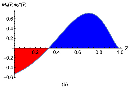 It is possible to show that the effectiveness of the PPs is the highest if the driving voltage sign is changed at each extremum of this function. Figure 4, Figure 5 and Figure 6 show the for the first three eigenmodes. When the first mode was excited, the O.V.D. had no voltage sign switch, because the minimum of coincided with and the maximum was located at the beam’s free-end, i.e., , (Figure 4a). The same conclusion could be made by analysing Figure 4b which shows the area subtended by the integrand function of , i.e., . As the integrand had no negative values, the area always stayed above the x-axis, sp no sign switch was entailed for the O.V.D. Conversely, when the second mode was excited, the O.V.D. involved a sign switch at , as the minimum of was achieved (Figure 5a). Equivalently, an analysis of Figure 5b shows that for the area subtended by the function was negative; this meant that the of the PPs within that region must have had the opposite sign of the one supplied to the remaining PPs. The O.V.D. in the case of the third eigenmode excitation entailed two voltage sign changes. The function had a local maximum at and a minimum at , and, thus, the voltage sign had to change at these values to obtain the O.V.D. (Figure 6a). The same observation could be made by analysing the graph in Figure 6b. It can be seen that the voltage distribution of the PPs within the region had to be the opposite of the remaining zones. In this way, the areas all stood on the same side with respect to the x-axis and the effectiveness of the PPs was maximised.