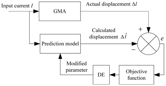 Model parameter identification is to estimate a set of parameters which ensure that the prediction model can best match the actual model. Based on large numbers of experimental data and the established theoretical model, the parameter identification is performed, i.e., calculation results are derived from the theoretical model with estimated parameters that can agree well with the experimental measurement. As a result, an accurate theoretical model according with actual process is determined. The parameter identification principle of a displacement model for GMA is shown in Figure 2. Firstly, the value range of parameter is determined and a prediction model is obtained through selecting a random in this range. Under the action of the input current, theoretical displacement is calculated from the prediction model. Meanwhile, actual displacement of GMA is obtained from the sensor. Then, model parameters are modified by using a differential evolution algorithm on the basis of error . Finally, the values of are optimized through minimization of the objective function, as in (16):