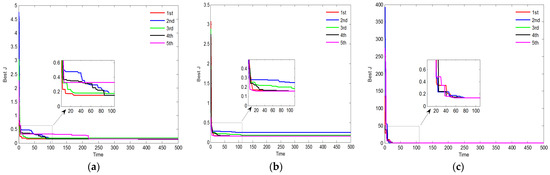 In the identification experiment, the population size is initialized to 100, the total iteration number is set to 500, and the objective function is as in Equation (16). Taking the measured data as the sample, we respectively use the GA, PSO, and DE to identify the displacement model parameters for the GMA. Here the GA’s parameters are crossover probability Pc = 0.8 and mutation probability Pm = 0.1. The learning factors of the PSO are c1 = 1.3 and c2 = 1.7, and in addition, its inertia weight becomes smaller in linearity from wmax = 0.9 to wmin = 0.1. The DE’s parameters are mutation factor F = 0.8 and crossover probability CR = 0.9 [23,24,25]. Parameter identification of evolution processes are shown in Figure 5a–c through repeating the identification five times randomly. The results obtained from different optimization algorithms are summarized in Table 1, Table 2 and Table 3.