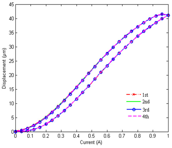 The displacement-current characteristic curves are shown in Figure 6. It is noted that the output displacements of the GMA, which are calculated from four groups of identified parameters, are in great agreement. Thus, the DE algorithm has excellent repeatability and stability.