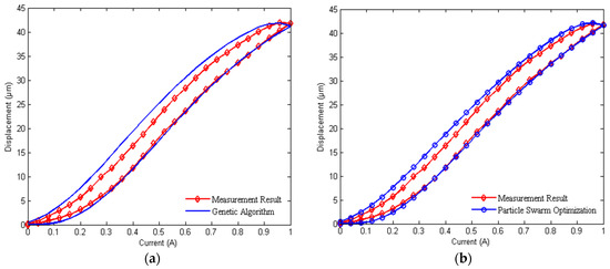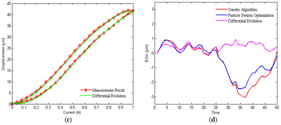 As illustrated in Table 1, Table 2 and Table 3, the best parameters identified by using GA, PSO, and DE are respectively put into the displacement model shown in Equations (1)–(7) and corresponding models are obtained. Based on the identified models, the output displacements are calculated and compared with the measurement data. The detailed comparisons between simulations and experiments are shown in Figure 7a–c. Figure 7d describes the errors between theoretical values and measurement values with different optimization algorithms. The average relative errors of the GA, PSO, and DE are 10.63%, 9.5%, and 5.02%, respectively. Experimental results indicate that the output displacements of the model calculated according to the DE agree well with the measured values. Clearly, the identification accuracy of the DE is higher than that of the other two algorithms.