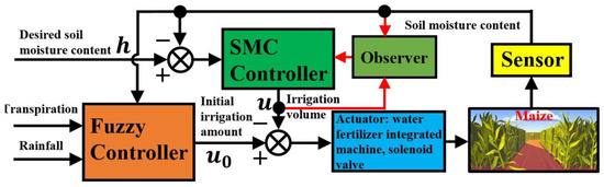 A diagram of the proposed intelligent irrigation method is shown in Figure 2, in which wireless sensor technology and wireless network communication technology are used. Firstly, the weather station’s multi-year climate database predicts the rainfall and crop transpiration for the coming week. The soil moisture is input into the fuzzy algorithm to derive the initial irrigation amount. The soil moisture and the desired soil moisture content are used to calculate the compensation amount through the sliding mode controller, combined with the initial irrigation amount to derive the final crop irrigation amount. The system receives the irrigation volume for the coming week as a control volume. It remotely controls equipment via the cloud port for irrigation operations when the crop needs water.