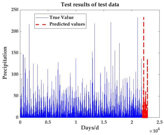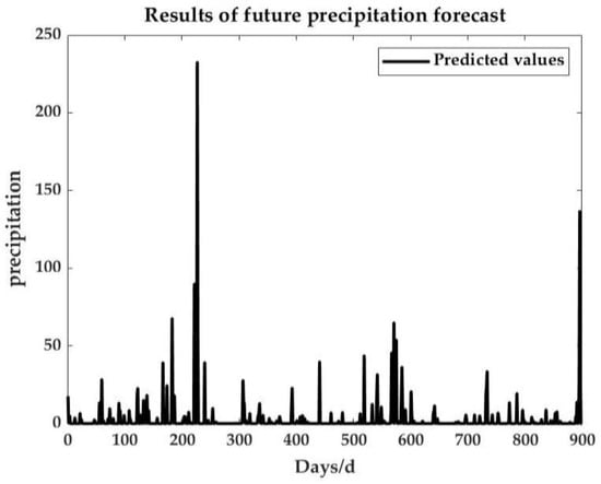 The Durbin–Watson (DW) test, which is used to test the first-order autocorrelation of the residuals in the regression analysis, is better the closer the value of this statistic is to two. The result of the Durbin–Watson test for this model was 1.9998, suggesting that the reasonable accuracy was high and the modeling met the requirements. Lastly, the research data were analyzed and predicted according to the established ARIMA(2,0,1) model. The combined test data and indicated data are shown in Figure 7, showing that the ARIMA model’s fitted results are similar to the actual rainfall variation trend. Future rainfall forecasts are presented in Figure 8.