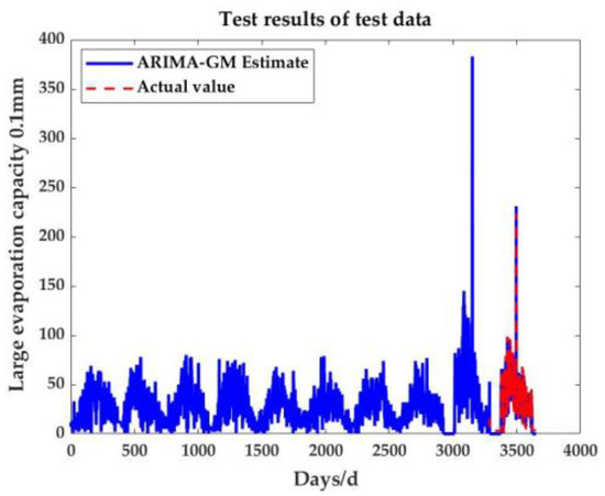 The Durbin–Watson operation resulted in 1.9921, with a high fitting accuracy, and the modeling satisfied the requirements. Eventually, transpiration was predicted by the established ARIMA(1,0,3) model. Comparing the expected data for 2019 with the accurate data from 2010 to 2019 indicates that the model prediction results and the actual evapotranspiration data have a similar tendency. The comparison plots and prediction results are illustrated in Figure 9 and Figure 10.