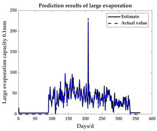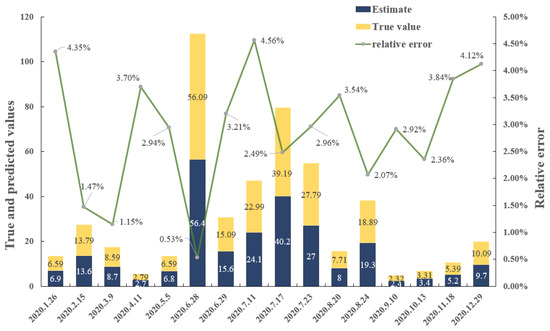 The predicted values of some precipitation and evapotranspiration in Suzhou City, Anhui Province were selected for comparison and analysis with the actual values, as shown in Figure 14 and Figure 15. It can be noted that the relative error is relatively small and the model has high prediction accuracy. The ARIMA model can be employed to anticipate future rainfall and crop evapotranspiration. It also provides a reference basis for irrigation volume decision making.