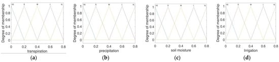 Affiliation functions for input and output quantities: (a) transpiration affiliation function; (b) precipitation affiliation function; (c) soil moisture affiliation function; and (d) irrigation volume affiliation function.