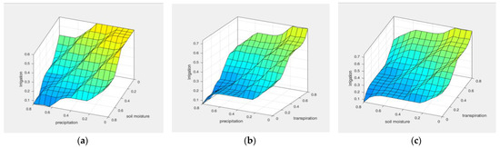 Fuzzy algorithm rule variable relationship diagram: (a) rainfall—soil moisture—irrigation; (b) rainfall—evapotranspiration—irrigation; and (c) soil moisture—transpiration—irrigation.