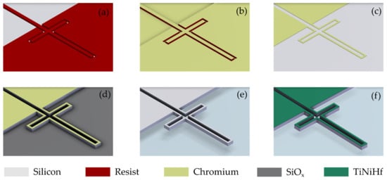Figure 3 shows a schematic of the process flow for fabrication of the TiNiHf/Si microactuators. This process follows our previous approach of micromachining and nanomachining a SOI wafer prior to SMA film deposition. It has the advantage that the SMA’s functionality is not impaired by silicon technology and film delamination is prevented [22]. The starting substrate is a silicon-on-insulator (SOI) chip with a 2 μm device layer and 2 μm buried oxide layer. In the first steps, the pattern of cantilever beams is transferred to a chromium layer by using e-beam lithography (EBL) (Figure 3a,b) and a lift-off technique (Figure 3c). A chromium layer of 30 nm is used as a hard mask to etch the Si device layer via cryogenic reactive ion etching (RIE) (Figure 3d). In the next step, the chromium layer is removed, and the buried oxide layer is selectively removed via wet etching using hydrofluoric HF acid to obtain freestanding Si beam structures (Figure 3e). In the final step, the TiNiHf film is deposited via DC magnetron sputtering near room temperature to obtain freestanding TiNiHf/Si bimorph microstructures. Amorphous SMA films are then crystallized at 635 °C via rapid thermal annealing. Scanning electron micrographs of the fabricated TiNiHf /Si microactuators are shown in Figure 4. The TiNiHf layer of 440 µm and Si layers of 2 μm thickness can be distinguished clearly.