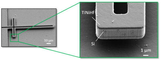 Shape memory alloy (SMA) microactuators are an attractive solution owing to their distinct characteristics, such as a large actuation force, large displacement and low actuation voltage. The unique properties of SMA films and corresponding microstructures and nanostructures fabricated thereof provide a basis for the development of ultra-small actuators and systems with enhanced performance [6,7,8]. SMA/Si cantilever beam actuators have been demonstrated to show favorable scaling in the actuation performance with lateral dimensions down to 50 nm [9,10]. An ultra-compact nanophotonic SMA switch has been realized by the co-integration of SMA/Si nanoactuators and photonic waveguides on the same chip [11,12]. Cantilever beam actuators based on polymer/TiNiHf/Si composites enable bistable actuation that could be scaled from the mm-scale down to the nanoscale [13]. This performance is enabled by the large transformation hysteresis of TiNiHf films above room temperature.