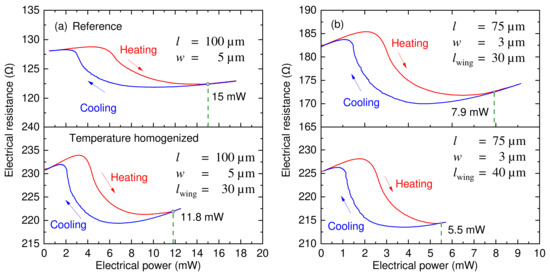 Figure 5. In situ SEM measurement of electrical resistance as a function of electrical heating power for different TiNiHf/Si microactuators. The beam length l , beam width w and length of folded beams l w i n g are indicated. The required electrical power to complete the phase transformation is highlighted. (a) Comparison of reference (top) and temperature-homogenized design (bottom), (b) temperature-homogenized design for different lengths of the folded beams ( l w i n g ) of 30 and 40 µm.