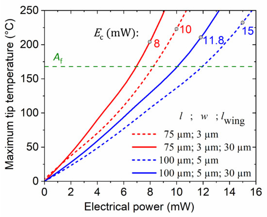 Figure 2 shows the simulated temperature profiles along the x-direction of a TiNiHf/Si cantilever beam for various values of electrical power. At 15 mW of electrical power, the reference design exhibits a maximum tip temperature of 247 °C, while the beam onset is near room temperature (Figure 2a,c). Consequently, only about 50% of SMA material has reached the austenitic finish temperature ( A f = 164 °C) and the remaining 50% remains in the martensitic state. Further increasing the electric power accumulates a large amount of heat at the cantilever tip and, thereby, increases the temperature gradient considerably. At 21.4 mW, the reference TiNiHf/Si design already reaches a temperature gradient of 8 °C/µm.