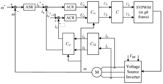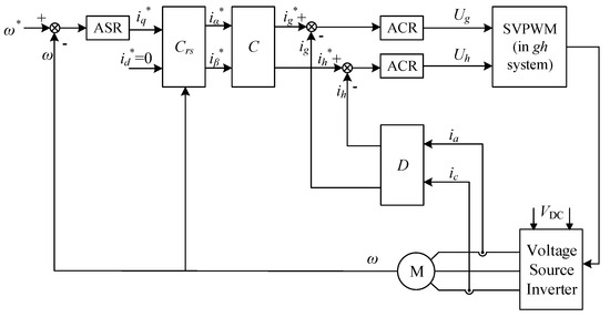 The FOC structure of the PMSM in the 60° coordinate system is similar to that in the conventional orthogonal coordinate system. The structure diagram is displayed in Figure 6. Although the reference currents ig* and ih* are AC components, they are converted from the reference currents id* and iq* and their phases are determined by the rotor position, so it is also a field-oriented control structure (FOC).