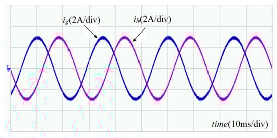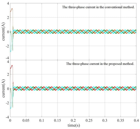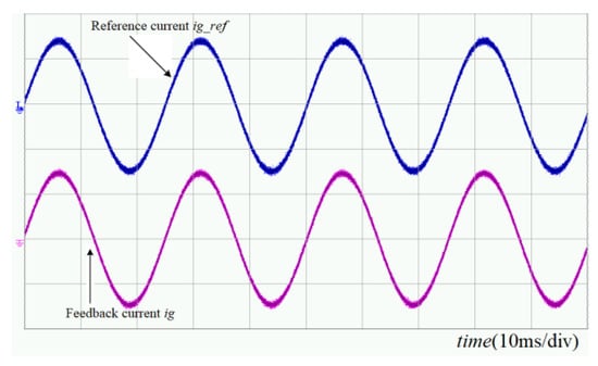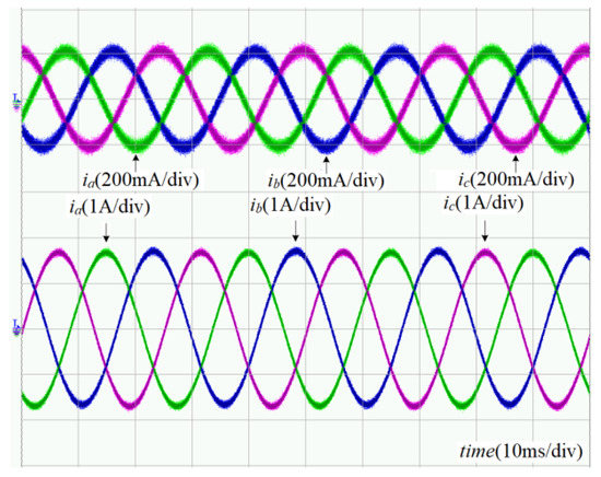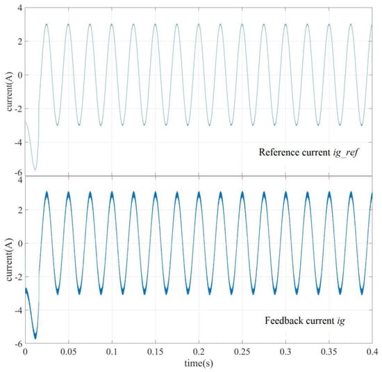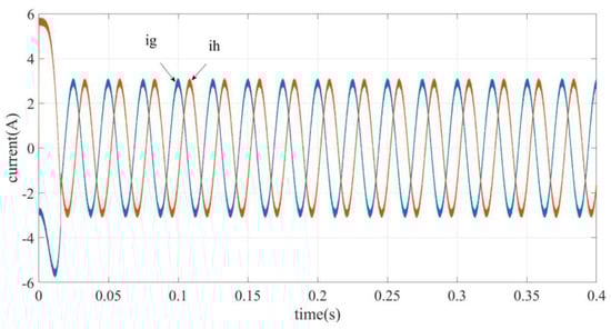 The three-phase current waveforms when the motor is in an approximately no-load state are illustrated in Figure 7. The three-phase current waveforms when the motor is under load are illustrated in Figure 8. The g-axis and h-axis currents of the motor are displayed in Figure 9. The reference current ig_ref and feedback current ig are illustrated in Figure 10.
