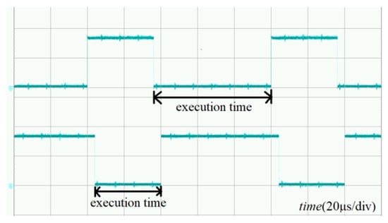 The algorithm is implemented in the interrupt program, and the interrupt duration is 100 μs. To determine the algorithm execution time, an IO port of the processor is set to a low level at the beginning of the interrupt program, and the corresponding IO port is set to a high level at the end of the interrupt program. The low-level time of the IO port is observed through the oscilloscope, that is, the code execution time to be observed. The execution time test results are displayed in Figure 20, in which the waveform above corresponds to the conventional coordinate system, and the waveform below corresponds to the 60° coordinate system.