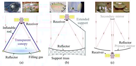 Different from those mainstream space telescopes using conventional materials for optical application, the novel catalog of reflectors made of polymers has recently attracted the attention of the astronomical community, for their great potential in stowability and areal densities, which offer technical feasibilities for the extremely large platforms of the observatory in space for various wavelengths. Figure 2 gives a view of three broad classes of concepts for polymer reflectors in development: (1) pressure stiffened membranes with inflatable gas maintaining the shape of the reflective surface [4]; (2) membrane antenna reflectors supported by a deployable truss mesh [5]; (3) form stiffened elastic shells with a doubly curved surface [6].