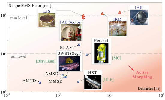 The core issue for the applicability of an ultra-light polymer reflector is how to form and maintain a shape with sufficient accuracy, especially with various disturbances in space. The surface accuracy can be measured by the root mean square (RMS) of the deviated shape (error), for which the requirement depends on the observing wavelength; for a space radio antenna, a magnitude of millimeters for the shape RMS error is generally required. However, the error budget for a reflector surface in the optical/infrared range is extremely limited and usually smaller than , where is the wavelength. Figure 3 presents a literature survey of the shape accuracy with respect to the reflector diameter of existing projects [12,13], showing a trade-off between the size and the precision of a reflective surface under the technological constraint for space and the current development of the polymer for large reflectors is based on inflatable structures only for radio astronomy, where the design focus is on enlarging the collecting area of microwave signals.