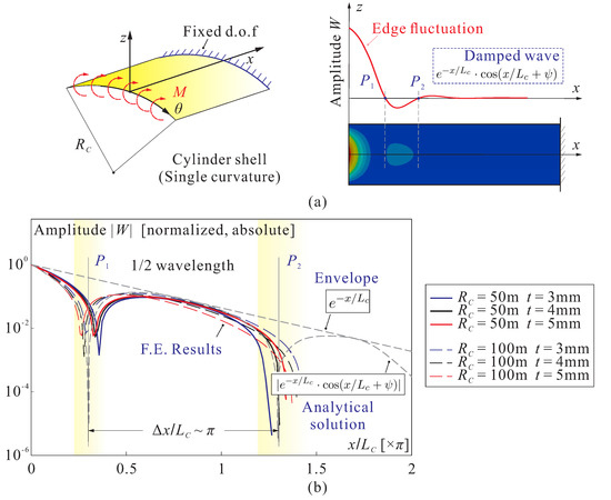 Numerical verification of damped wavy deformation on the edge of a cylinder thin shell with a single curvature (), where the characteristic length and various radii of curvature and thickness t are tested, showing a good agreement with the analytical solution of Equation (5): (a) an illustration of the numerical model of a cylinder shell deformed by a moment load; (b) the comparison between the numerical results of the deformation in axial direction and the analytical solution of Equation (5).