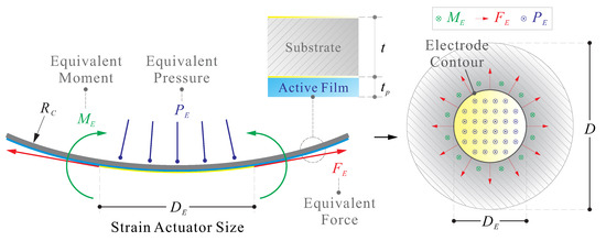 In this study, the shell substrate will be covered by a thin layer of linear electroactive film (piezoelectric) and deformed via applying voltages to an array of electrodes. Usually, the unimorph strain actuation on a flat plate can be modeled by a set of equivalent forces consisting of a force normal to the contour of the electrode, which acts in the tangent plane, and a moment acting on the contour of the electrode, e.g., for voltage-driven isotropic piezoelectric film actuators, the force and moment per unit length are, respectively [18],