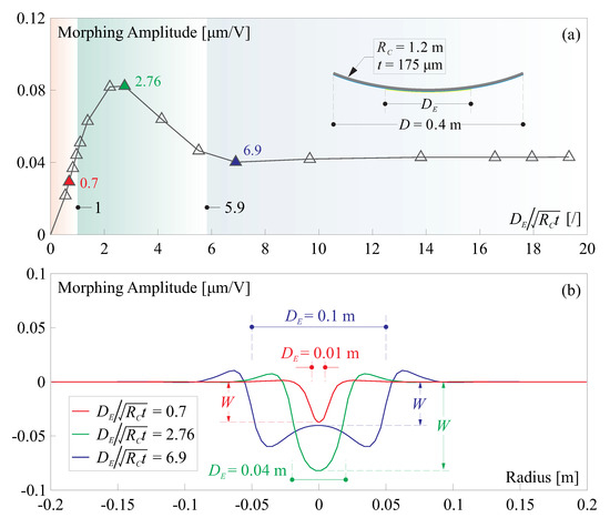 Figure 6a shows an evolution of the morphing amplitude excited by a unit voltage, with a change in the dimensionless geometric factor . The results are verified by a simulation on a thin (m) spherical ( m) shell with a diameter of m, with a central unimorph actuator of various electrode sizes. In the test, the active layer uses piezoelectric polymer material PVDF-TrFE, with properties of GPa, , , and pC/N.