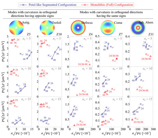 Figure 8 plots the simulated performance of active shells on forming some low-order Zernike modes; the wavefront RMS error and voltage range are computed via Equation (17), where the compensated target is substituted by for the i-th Zernike mode. The results are presented in a form of plotmatrix, in which each subplot shows the relationships of the morphing amplitudes in a given voltage (PV/) versus the normalized forming accuracies (/PV) for various electrode patterns. According to those results, significantly larger amplitudes of the deformation can be found for petal configurations, for generating a target shape where the curvatures in orthogonal directions have the same signs (Defocus Z4, Coma Z7, and Spherical Aberration Z11). The active reflector with a petal-like division presents excellent performance for the surface error reduction for forming Defocus Z4, and this can be impacted by the radial order of the electrode pattern; when the targets are Coma Z7 and Spherical Aberration Z11, even a slight degradation can be observed (for Spherical Aberration Z11) compared to monolithic (full) configured reflectors.