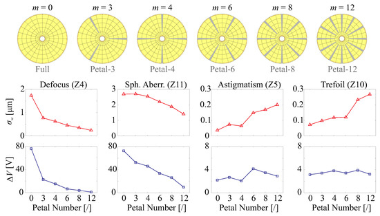 Performances of active surface control (the wavefront RMS error and the voltage range ) with different numbers m of petal segmentation. The electrodes are arranged with a keystone pattern of and , and the amplitude of the target shape is PV = 10 μm.