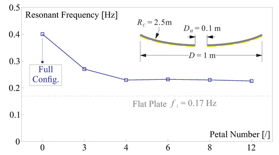 Figure 10 illustrates the softening effect of the petal segmentation on a curved thin-shell reflector. The numerical examples in Figure 7 are tested, and the resonant frequency (plotted in Hz) decreases with the petal number because the division of the reflector reduces the hoop stiffness. Therefore, larger responses to the disturbances might be present for the petal configured reflectors, resulting in a larger shape error to be compensated by those strain actuators.