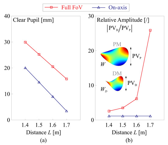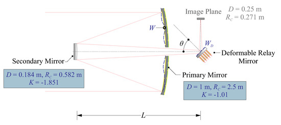 This study is based on a classical R-C design of space telescope as shown in Figure 11: the telescope optics consist of a hyperboloid concave primary mirror and a hyperboloid convex secondary mirror, and this configuration eliminates passively both typical optical errors of on-axis Spherical Aberration Z11 and off-axis Coma Z7/8, enabling a wide field for observation and is widely used for astronomical telescopes. The active primary mirror uses the structural parameters of the unimorph thin shell investigated in Section 3 with a conic constant of (very close to the paraboloid mirror). The telescope is designed with a full FoV of 9.6 arcmin and an overall f-number of 9. A deformable relay mirror is utilized to fold the optical path, and the deformation is actively controllable to abate the optical error made by the residual shape error W of the primary. Two parameters determine the layout of this mirror: the folding angle and the distance L to the secondary mirror, which influence the compactness of the space telescope structure.