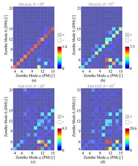 in which the matrix T is obtained by utilizing the ray tracing technique, with an inverse optimization process on minimizing the central moment of spots diagram on the optical terminal. Note that this method applies for other sources of optical errors, e.g., the shape error of the secondary mirror or the misalignment within optical surfaces. Usually, the entries of T are the functions of the folding angle and the FoV. Figure 12 gives a view of the elements in T, where the mapping orders for and are and , respectively, the modes of Piston (Z1) and Tilt (Z2/3) are not involved because they do not affect the image quality, and m is a constant in this example.