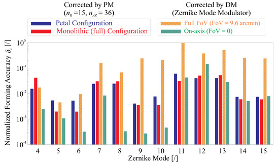 In general, the performance for wavefront error reduction can be improved by a finer patterning of the electrode array (i.e., by using large values of and for the keystone layout); this applies for most cases in Figure 8, except that the performance of the monolithic configuration is insensitive to the radial order when forming target shapes with periodically fluctuated edges (Astigmatism Z5 and Trefoil Z10) or axisymmetric shapes (e.g., Defocus Z4 and Spherical Aberration Z11). On the other side, the increased number of electrodes deteriorates the Jacobian matrix conditioning, leading to a larger consumption of the applied voltages. Table 2 lists the results of the modal reconstruction for 10 μm amplitude shapes of Defocus Z4 and Astigmatism Z5; the condition number of J is computed by the ratio between the maximum and minimum singular values of the matrix, and this increases with the electrode number. In addition, a reference case with a monolithic configured reflector is also reported, and the electrode number is chosen to be close to the approximate value based on Equation (15); thus, a good performance can be expected for the wavefront error reduction. Note that petal-configured active reflectors require much fewer electrodes and exhibit better performances in achieving larger actuation strokes.