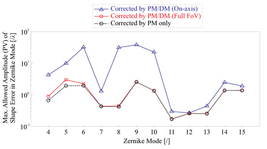 Maximum allowed amplitudes of surface errors (in ) for different modes.