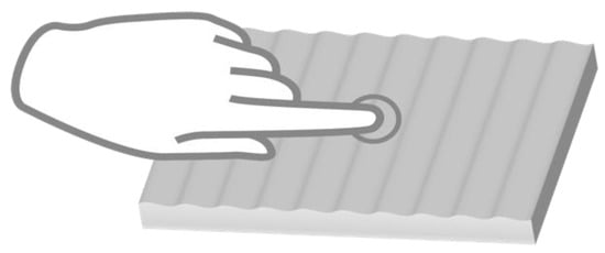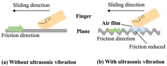 Thus, in terms of haptic types, there are two important routes to provide surface haptic feedback: One is vibrotactile haptic, which only provides simple vibration prompts and can be perceived well when the frequency is below 1 kHz. The other is ultrasonic haptic, which provides more expressive tactile control and more complicated haptic effects by creating friction modulation when the fingers slide on the surface [9,25,26]. When the touch panels are excited and vibrated in ultrasonic frequency, standing Lamb waves are generated to produce the out-of-plane displacement which enables haptic interfaces [27,28]. This vibration traps a thin layer of air at the skin–surface interface, which is known as the squeeze film effect [21,29,30]. The friction between the air film and the surface is reduced by vibration (illustrated in Figure 3), and its degree of decline will depend on the vibration amplitude [31,32,33]. This frictional tactile impression can be transferred into fingers by “air smoothness” [29]. Therefore, the dynamic adjustment between the ultrasonic wave amplitude and frictional sensation makes it possible to provide complex tactile sensations [34,35].