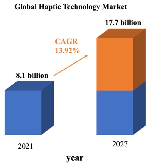 The global haptic technology market size remains large and growing. The market reached USD 8.1 billion value in the year 2021 globally, and it is forecasted to progress at a compound annual growth rate (CAGR) of 13.9% during the years 2022–2026 and will reach USD 17.7 billion by 2027, as shown in Figure 2. According to the different total market estimations, while the final value by 2027 may change from USD 17.7 billion to USD 41.42 billion, the CAGR of at least more than 10% during the forecast period is a consensus [6,7].