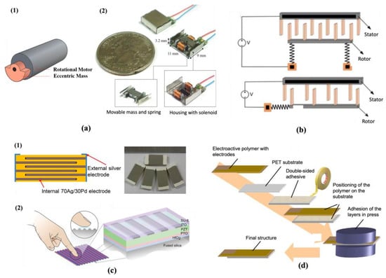 Different types of actuators: (a) Electromagnetic actuators: (1) eccentric rotary mass (ERM) vibration motor. Reproduced with permission [40]. Copyright 2021, Springer Nature. (2) Linear resonant actuators (LRAs). Reproduced with permission [41]. Copyright 2015, Elsevier. (b) Electrostatic comb-drive actuators. Reproduced with permission [42]. Copyright 2017, Springer Nature. (c) Piezoelectric actuators based on ceramics: (1) multilayer cross-section structure and samples. Reproduced with permission [43]. Copyright 2016, John Wiley and Sons. (2) Transparent thin-film structure. Reproduced with permission [38]. Copyright 2021, John Wiley and Sons. (d) Electrostrictive actuators in the fabrication process based on electroactive polymers (EAPs). Reproduced with permission [44].