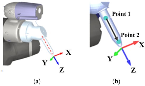 From Figure 2, we can find that since the cylindrical tool is symmetrical in the X and Y axes, the rotation error along the z-axis is negligible. In this case, if the actual position and direction of the TCP, i.e., the coordinate system of the tool, is required, only the axial direction of the tool is required and then the direction of the coordinate system can be obtained by calculation. Once the direction of the coordinate system is obtained by calculation, the position of the coordinate system can be calculated by finding the end of the tool along the axial direction (Figure 2b).