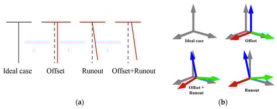 Before deriving the various theoretical formulas, it is necessary to define the tool state before calibration. There are four types: Ideal case, offset, runout, and offset with runout (Figure 4a) [].