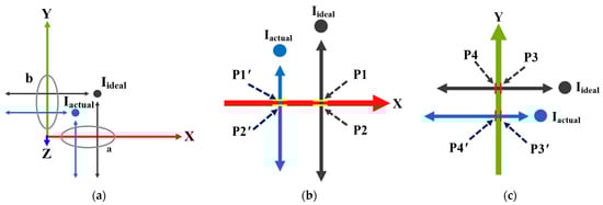 Runout calibration can be divided into three steps. First, the tool center offset is calculated by position method and then the projection angle is derived. Finally, the rotation matrix can be solved to express the position of an object rotating in space. The position method is used to derive the tool center offset and record the position of the tool when the laser beam is triggered. As the laser sensor is triggered, the coordinates of the TCP are recorded in real-time, and four positions of the TCP are known in each moving cycle. Figure 5a shows the actual and hypothetical trajectories and Figure 5b,c show the position of the tool when it triggers the laser sensor. There are two laser beams, one is along the X-axis and another one is along the Y-axis, Iideal is the ideal into point, Iactual is the actual tool into point, and P1 to P4 is the position when the laser sensor is triggered.