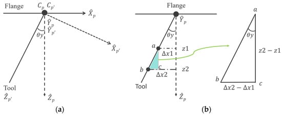 After calculating the tool center offset, the runout angle can be obtained by performing a trigonometric calculation by the height difference. Figure 6a represents the ideal tool coordinate system (Cp) and the runout error of coordinate system (Cp′). When the tool has a runout error, the base point of the tool on the flange coordinate system is defined as (,,) and the projection angle is defined as θy in Y-axis. As two laser sensor units are parallel to the X and Y axes of the coordinate system, then the tool contacts the X and Y laser four times during the linear motion of the laser device. The projection angle θy can be found by Equation (6).