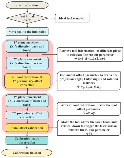 The calibration process is shown in Figure 8. In the runout calibration, the actual tool information is obtained after two planes of motion and the tool center offset parameters can be obtained, which are then used to calculate the runout angle and rotation matrix. The first preliminary offset calibration is also performed. After completing the runout calibration, a second preliminary offset calibration is executed using the tool information obtained from the third plane motion to accurately calculate the X and Y axis offset parameters based on the tool coordinate system. The last process is the final offset calibration. The tool moves over the laser beam, triggering the laser sensor to go vertically down and find the Z-axis parameters of the TCP according to the tool coordinate system.