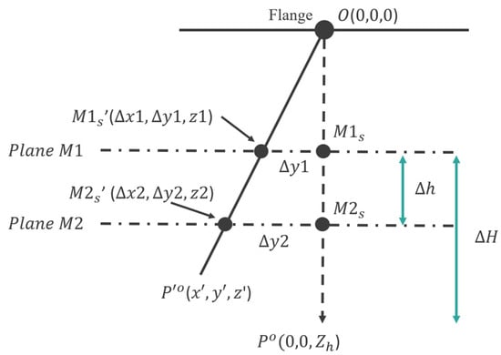 Looking in from the positive direction of the Y-axis of the coordinates of the tool mounting point, where O is the tool mounting station and the origin of the coordinate system, the coordinates of are (0, 0, Zh) and the coordinates of are (x′, y′,z′). Let the first plane of calibrated motion be M1 and the second plane be M2, where intersects with plane M1 at and with plane M2 at , intersects the plane M1 at , intersects the plane M2 at , and the parameters ∆x1, ∆x2, ∆y1, ∆y1 have been obtained from Equation (6). Let the height from plane one to , labeled be ∆H, and the height between plane one and plane two, labeled be ∆h. After defining the above information, the following Equations (12) and (13) can be obtained.