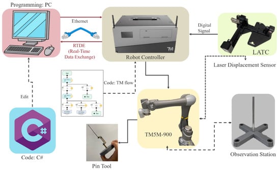 For comparing with LATC’s existing product, the LATC’s calibration software is used to perform the four-quadrant experiment and record the data. First, a calibration speed of 40 mm/s was setup in LATC’s software compared with proposed method of 60 mm/s shown in Table 11. Second, the calibration process was almost identical but the motion flow was still a little different. For LATC’s entire process, it was programmed in the TM flow system, meaning that all motion, trigger IO, matrix calculations, and position settings were in the same system. For our proposed method, the TM flow system is used to present the robot motion, sensor triggering, and data exchange to the computer, and then use C# to receive the robot information for calculation, processing algorithm, and to send the robot arm position back to the robot. Third, the whole process of using software for LATC is about 70 s, however, our proposed method was about 50 s.