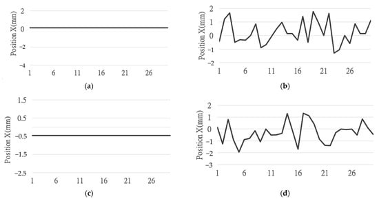 Calibration data of X position: (a) pencil tool at 20 mm/s; (b) pencil tool at 50 mm/s; (c) cylinder tool at 20 mm/s; (d) cylinder tool at 50 mm/s.