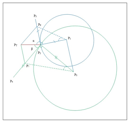 Performing the same calculations for , the coordinates for the point were obtained with Equations (17) and (18):