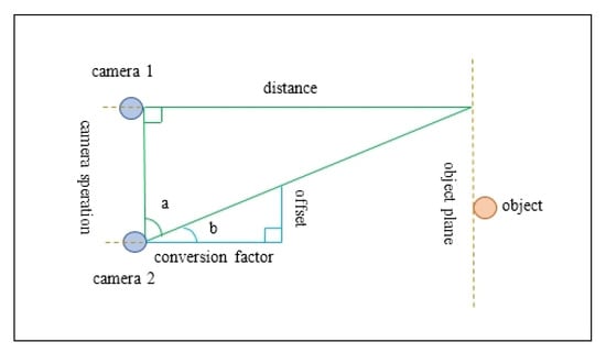 The offset was calculated as the difference between the initial points of the left and right images, acquired by the two cameras, as shown in Equation (20):