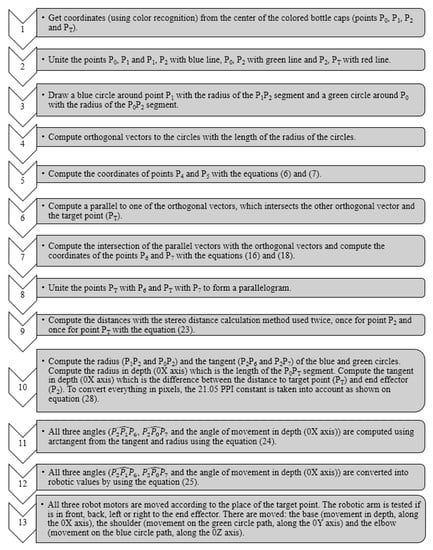 In this section, the proposed method is presented, which can compute the target position of the robotic arm in the 3D space. This proposed approach is based on the combination of two algorithms. The first algorithm is the joint detection method in the 2D space (axes and ), using image processing techniques. The second algorithm is the stereo distance calculation algorithm, which computes distances in the third dimension (axis ), using two video cameras in stereo mode.