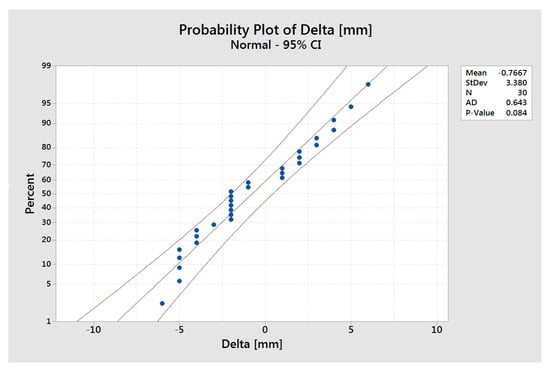 Figure 5 shows the normal probability plot, with a 95% confidence interval, of the delta (error), which is the difference between the real value and the measured value. The mean of the delta (error) is −0.7667 mm, which is acceptable. The standard deviation is 3.38 mm. This could cause the robotic arm to oscillate, but with the auto-calibration method, the system being in a loop, the robotic arm can easily get in the desired target position, by the repeated use of the presented algorithm. The authors made video recordings to demonstrate that the robotic arm can reach the desired position. The (Anderson–Darling) value is 0.643, and the p-value is 0.084, which is greater than = 0.05, so we fail to reject the null hypothesis and the delta (error) is not statistically significant because it has too few values. However, even in this situation, the values are very close to the real distance.