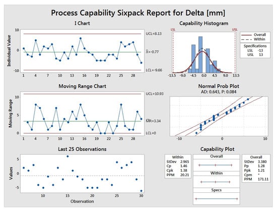 In Figure 6, a capability analysis of the 30 distance measurements is presented. The charts (individual value and moving range) are in limits. The histogram has a Gaussian trend, but for a histogram, 30 values are not enough. It is also observed in the histogram that there are no measured values where the delta (error) is 0. This means that there is no measurement without error, but this is not a big issue because these errors are very low. In the normal probability plot, the (Anderson–Darling) value is 0.643, and the p-value is 0.084. Thus, it is greater than = 0.05, so we fail to reject the null hypothesis, and it can be said that the delta (error) is not statistically significant because we do not have enough values. However, in this situation, the values are also very close to the real distance. The most important part is the values in the conclusions, where the standard deviation is 2.965 mm within the subgroup and 3.38 mm in the overall measurements. The value is 1.38, which is more than 4, which is a very good result for a real system. The is 1.46, is 1.28, and is 1.21. All the values are very close to 4, which is a very good result for a real system. The (the error per one million measurements) is 20.21 within the subgroup and 171.11 in overall the measurements. This value is also a very good result.