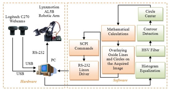 Figure 7 shows the block diagram for the experiment of the detection of robotic arms in space. On the hardware side, there are two web cameras connected to the USB port, and the robotic arm is connected to the RS-232 port [] of the PC. In the software part, histogram equalization is carried out to unify the image. Then, an HSV (hue, saturation, value) filter was used, the contours of the colored dots were detected (using edge detection), and finally the centers of the circles were computed, which were drawn around the colored dots detected. The colored dots are actually the markers placed at the joints of the robotic arm. The markers are made by using colored bottle caps. Mathematical calculations are made again, and circles and lines are drawn on the image to guide the calculations []. The colored dots detected are connected with lines and the circles are drawn around the detected colored dots. The center of the circles around the detected colored dots helps to connect the colored dots through their center. After mathematical calculations, the movement distance of each motor is converted into “robotic commands” (SCPI commands) and then sent to the robot using the RS-232 Linux driver.