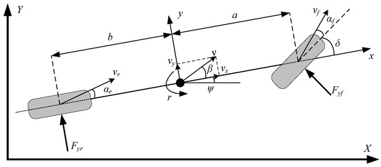 In this paper, the body dynamics of the vehicle in three directions, longitudinal, lateral, and yaw, were established using Newton–Euler theory, as shown in Figure 1.