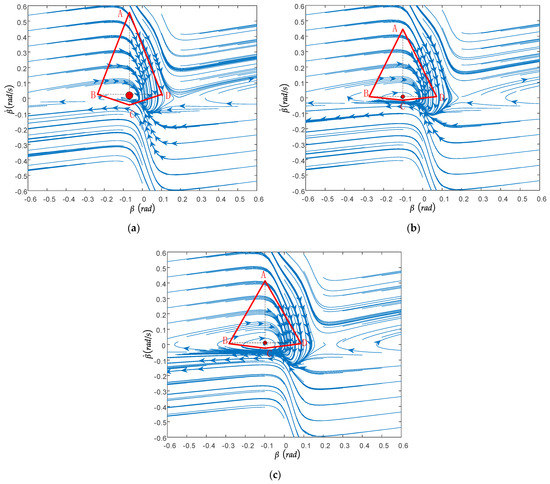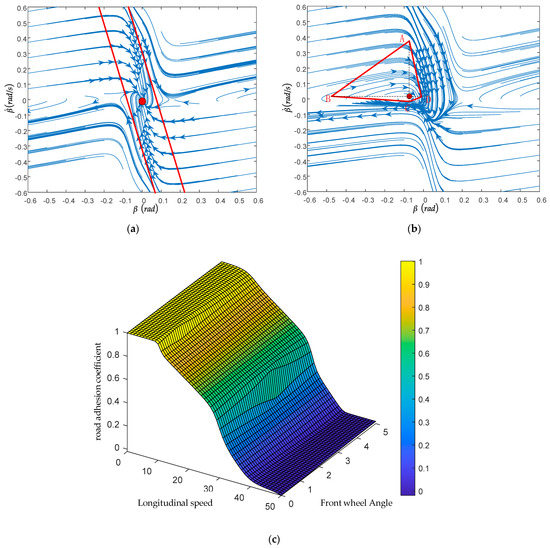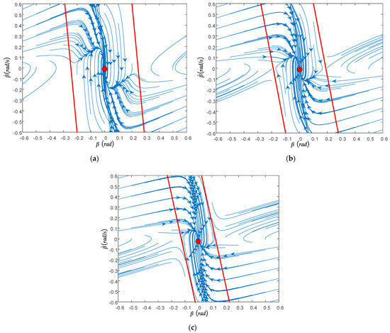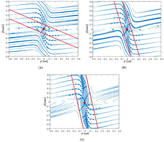 The road adhesion coefficients were selected as 0.3, 0.6, and 0.9, respectively; the front wheel angle was guaranteed to be 0°, and the longitudinal speed was unchanged at 40 km/h. As shown in Figure 7a–c, the trajectory of the phase tending to stability is mainly distributed symmetrically according to the origin of the second and fourth quadrants, while the trajectory of the first and third quadrants mainly diverges. With the increase in road adhesion coefficient, the slope of the stable boundary and the stable region increase gradually. Combined with Figure 7, it can also be seen that when the front wheel angle is 0, the type of phase plane will not change.